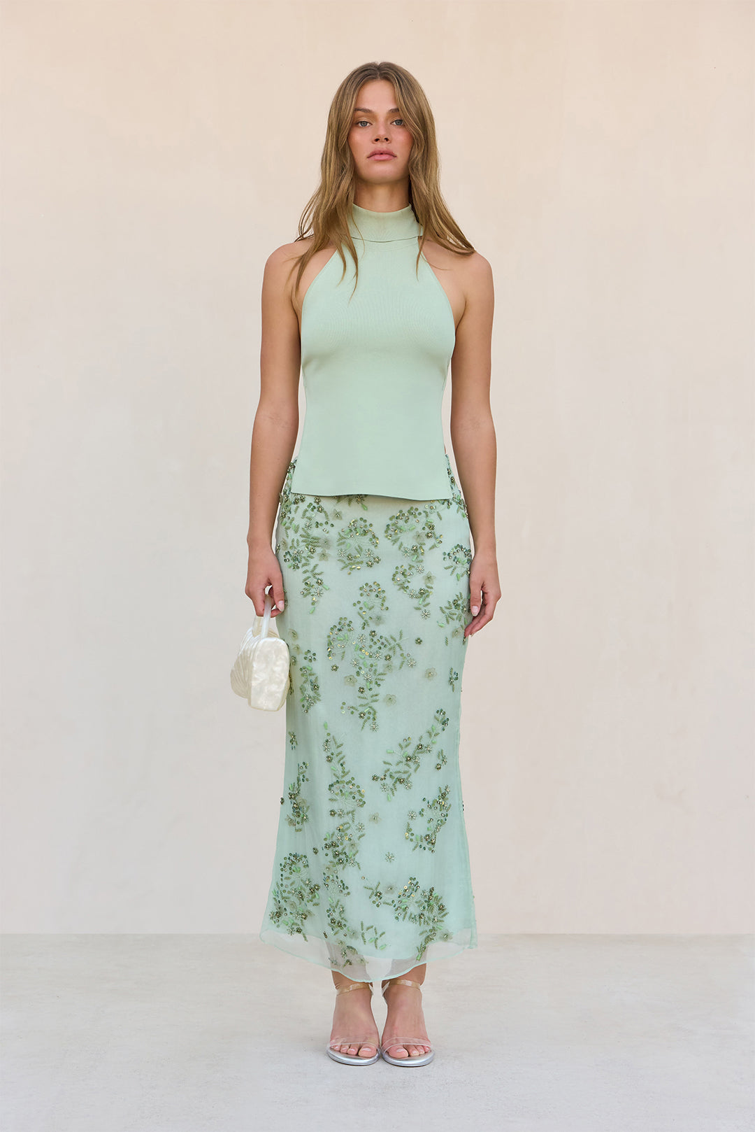 A high-neck, fully open-back halter top with wide back strap and narrow mock neckline.